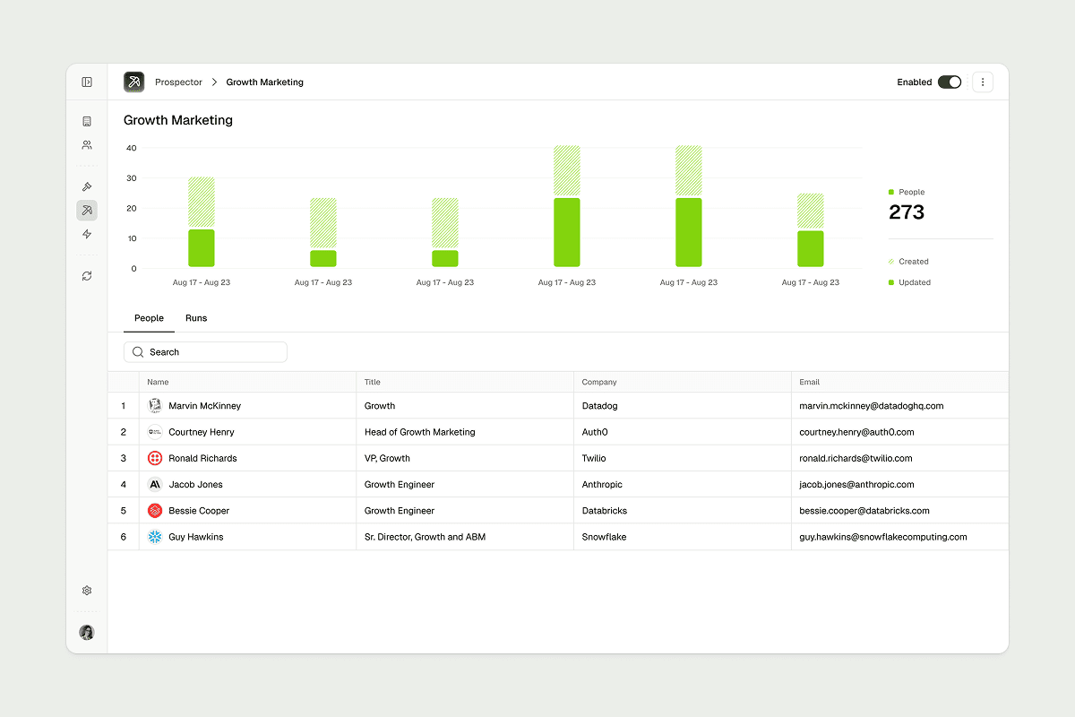 Welcome to always on prospecting. With access to over 700 million profiles, our Prospecting Agent helps you find the right contacts at any company precisely when you need them - fully enriched with Email, Mobile, and LinkedIn profile.